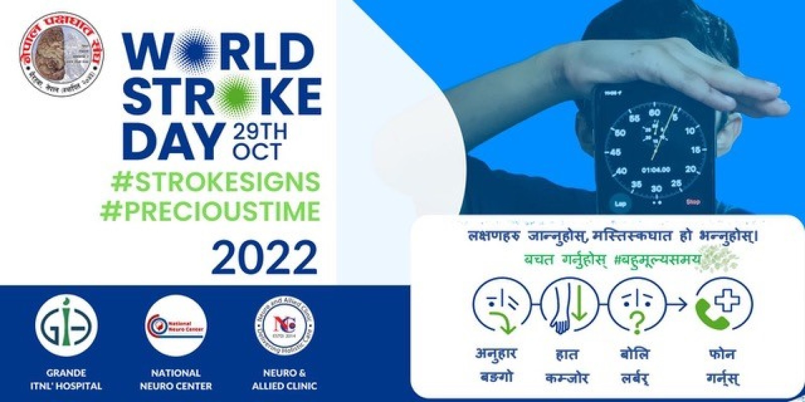 The campaign was based on the FAST (face, arms, speech, time) acronym as well as utilising campaign materials from The World Stroke Organisation’s World Stroke Day 20214, which carried the message #precioustime and highlighted the importance of learning the signs of a stroke. These messages were translated to Nepali and disseminated across the media platforms. A website with further information and resources was also created.