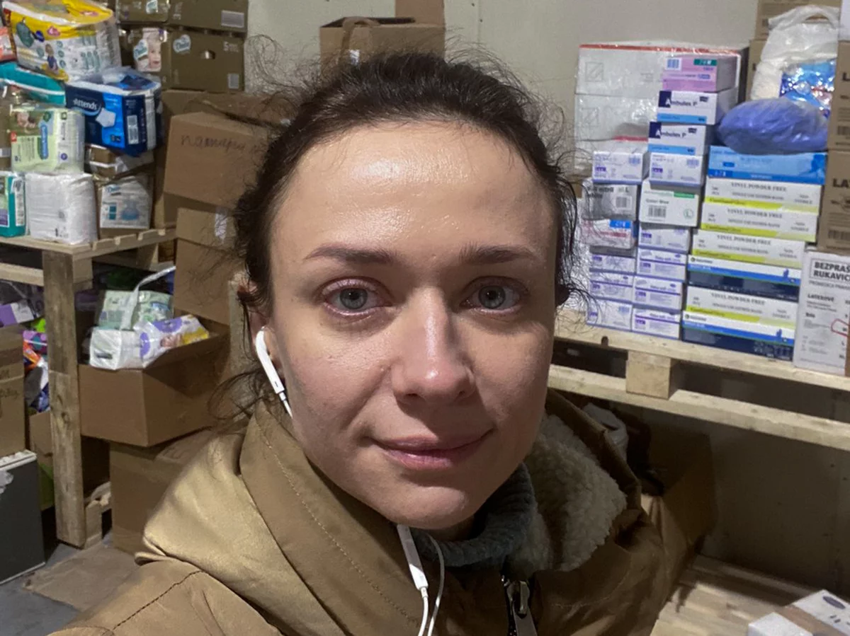 Aleksandra Shchebet takes a selfie in a warehouse in Lutsk where she spends long days packing up donated food and medical supplies. The neurologist from Kyiv, who turns 37 on Sunday, March 20, fled the bombing but stayed in Ukraine to help by offering consultations online and on the phone as well as volunteering in the warehouse. Aleksandra Shchebet