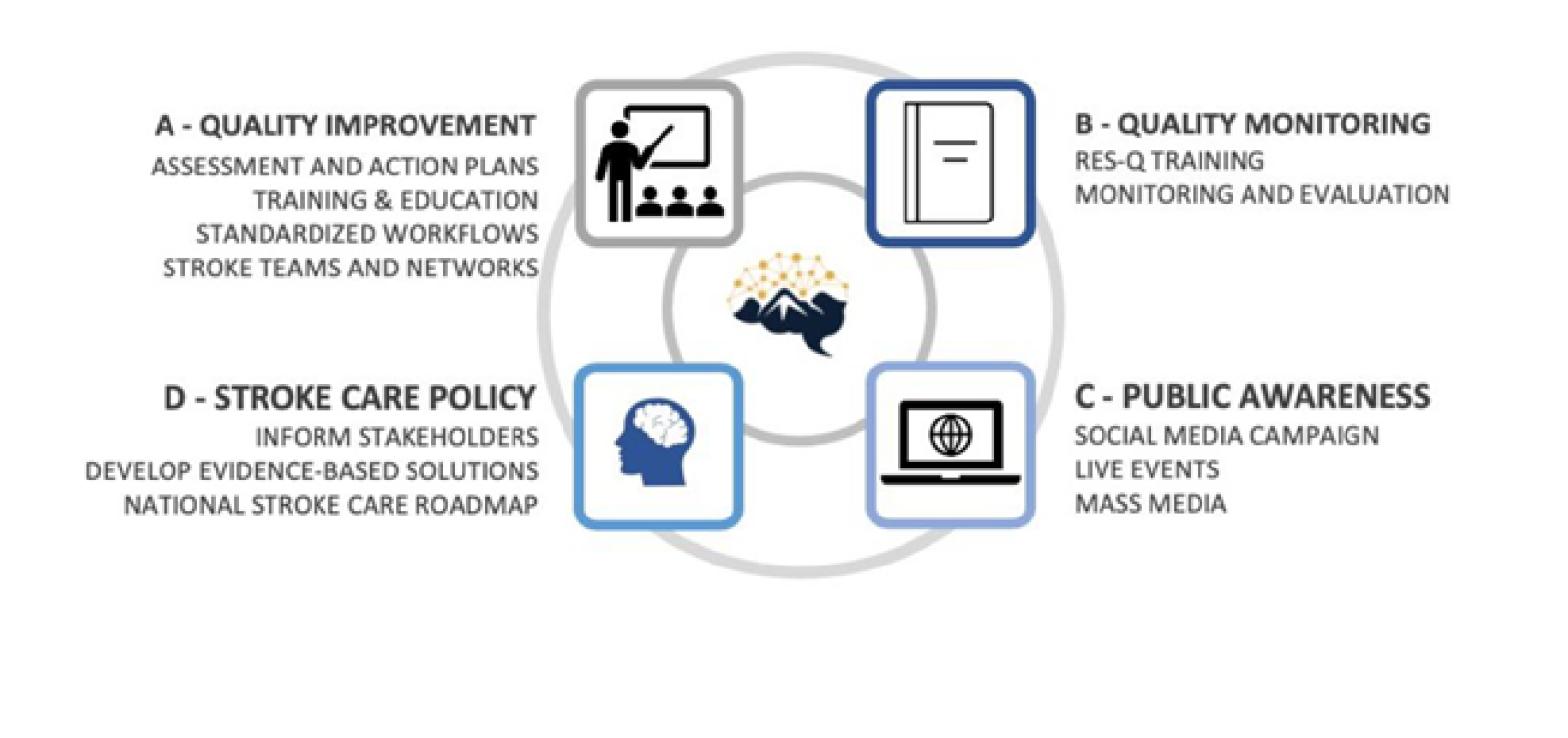 Nine tertiary hospitals in Nepal's urban hub areas were selected to take part in the project. Stroke care is a complicated and multi-faceted process and four areas of action were identified in order to engage both those at grassroots level (doctors, nurses, patients, and hospital boards) as well as policy-makers (government and health officials) and the general population, aiming to stimulate improvements for acute stroke care across Nepal. These four action areas were: quality improvement and monitoring, stroke care policy and public awareness (Figure 1).