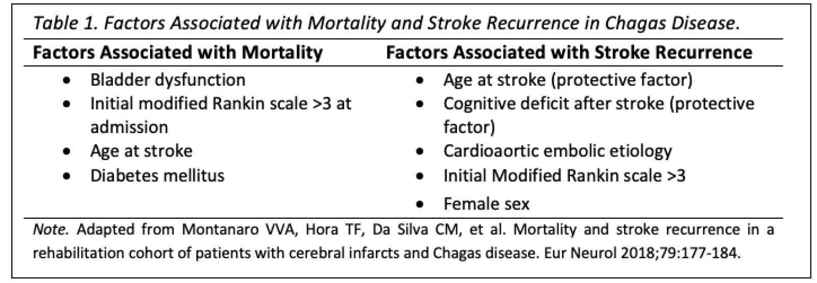 Montanaro VVA, Hora TF, Da Silva CM, et al. Mortality and stroke recurrence in a rehabilitation cohort of patients with cerebral infarcts and Chagas disease. Eur Neurol 2018;79:177-184.